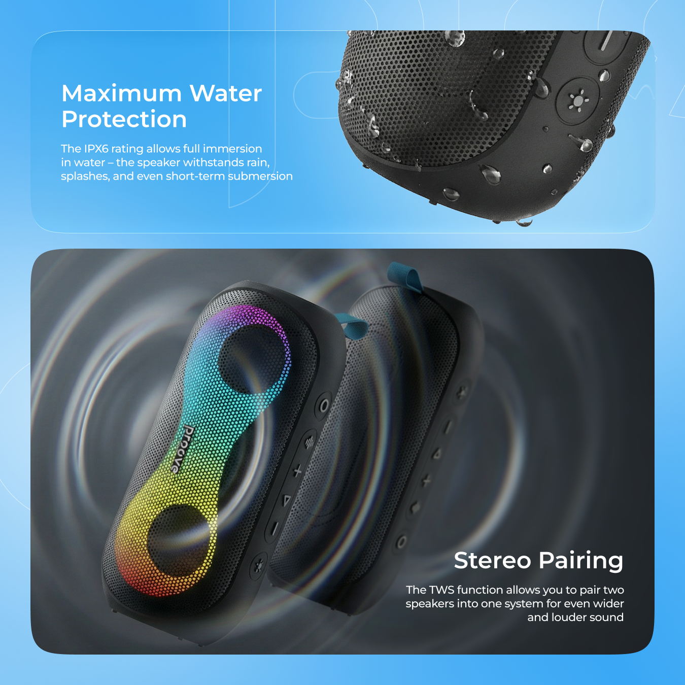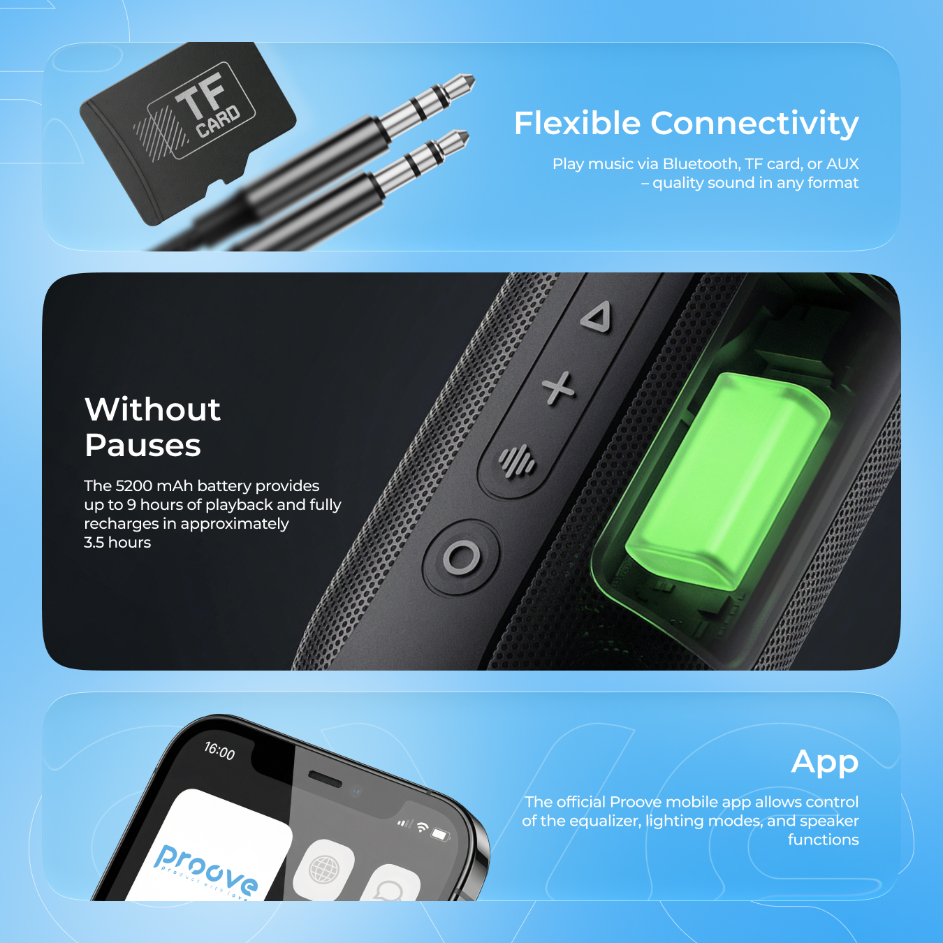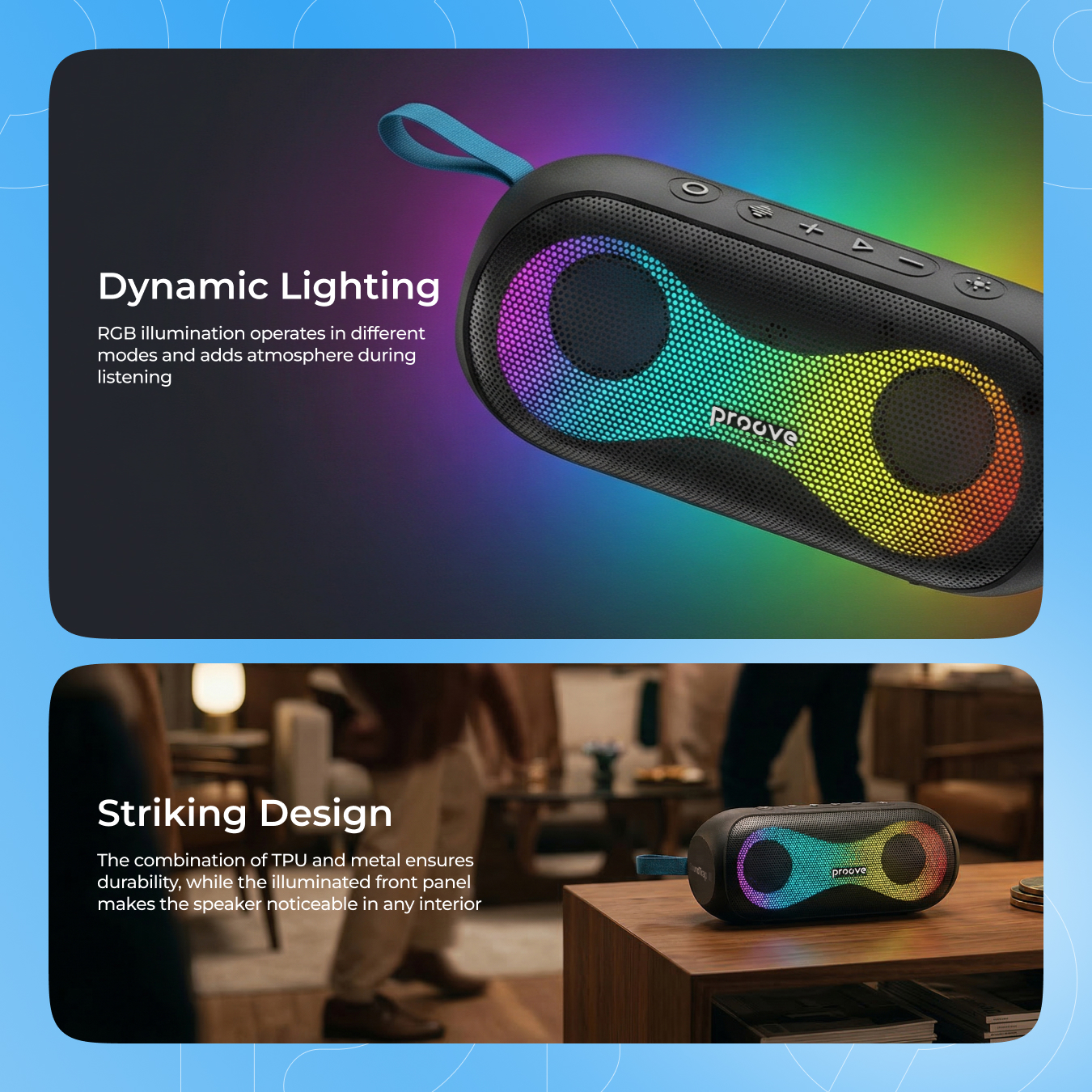 The Proove SoundTrap III portable speaker features two 15W drivers and delivers rich, full sound with clear highs and noticeable bass. With 30W of total output, the music stays detailed both indoors and outdoors.