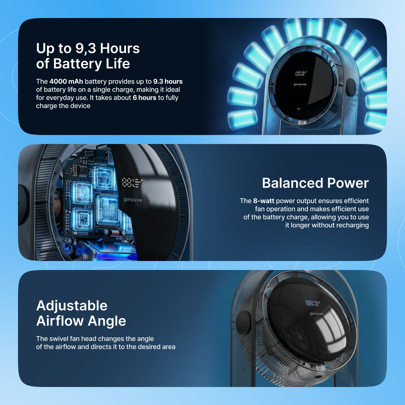 The 4000 mAh battery lasts up to 9.3 hours, depending on the mode. Charging takes about 6 hours via the Type-C port. A clear LED display shows the battery level and current speed.
