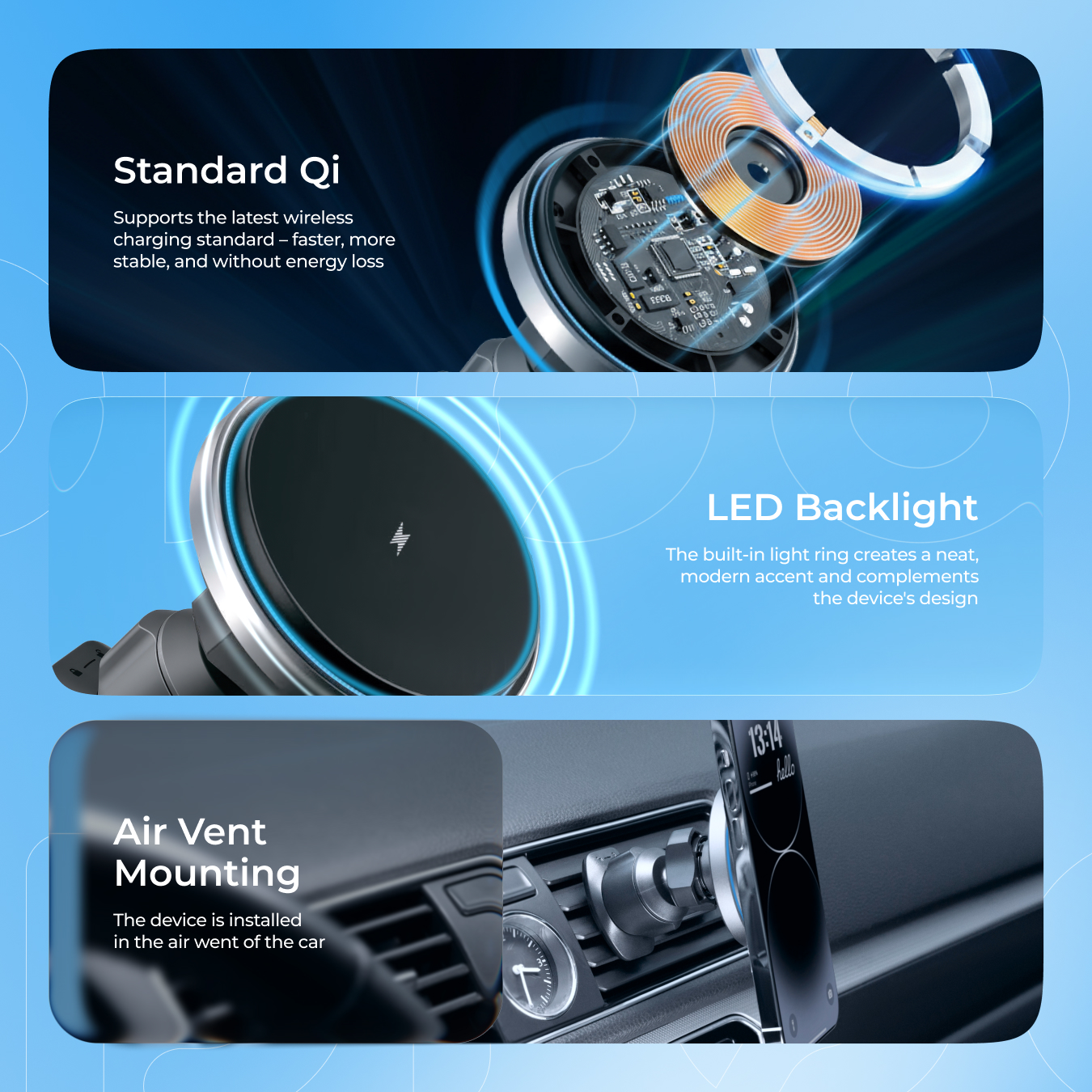 Magic Circle Pro is made of plastic and aluminum to complement the aesthetic appearance of the car interior. The input current is 5V/2A, 9V/2A, and the output current is: 5V/1A, 9V/1.25A, 9V/1.67A. The total power of 15W allows you to charge your phone quickly without any wires.