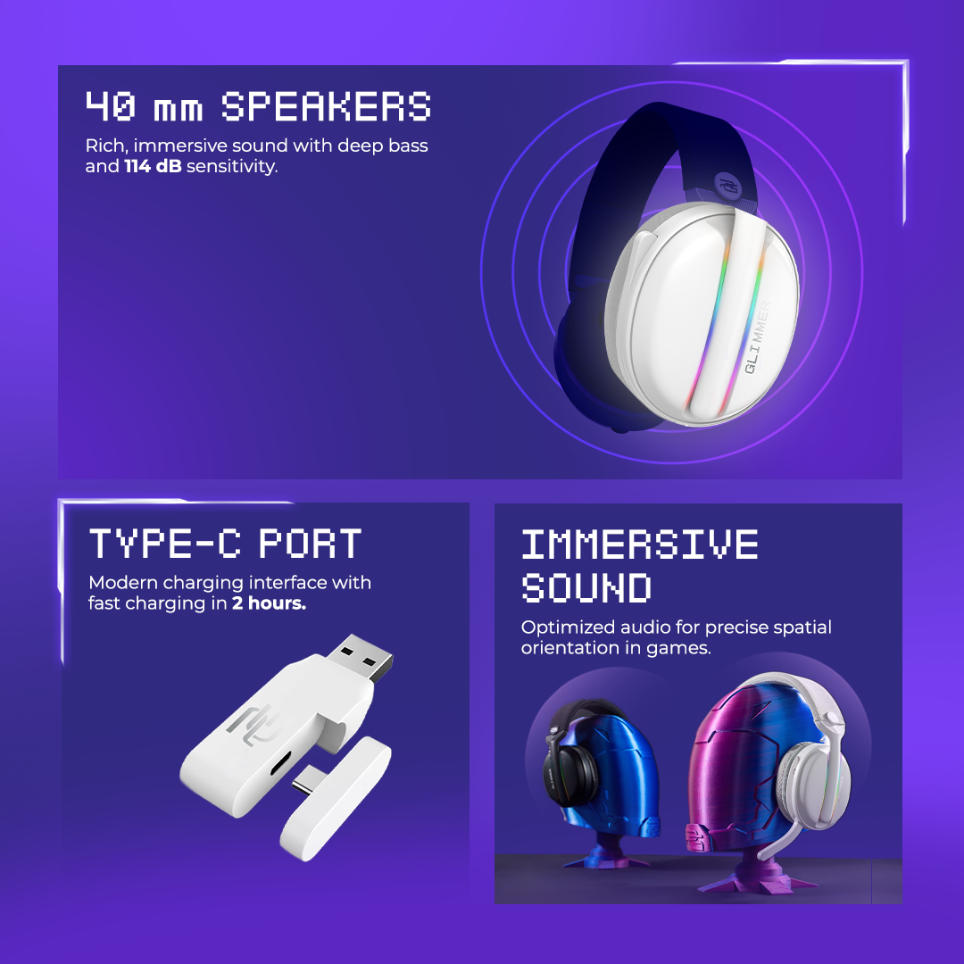 With Bluetooth 5.4 and 2.4GHz connectivity, the headphones are suitable for a variety of use cases, from gaming to calls. The integrated high-sensitivity microphone ensures clear communication. The high-capacity battery guarantees up to 59 hours of use without backlighting.