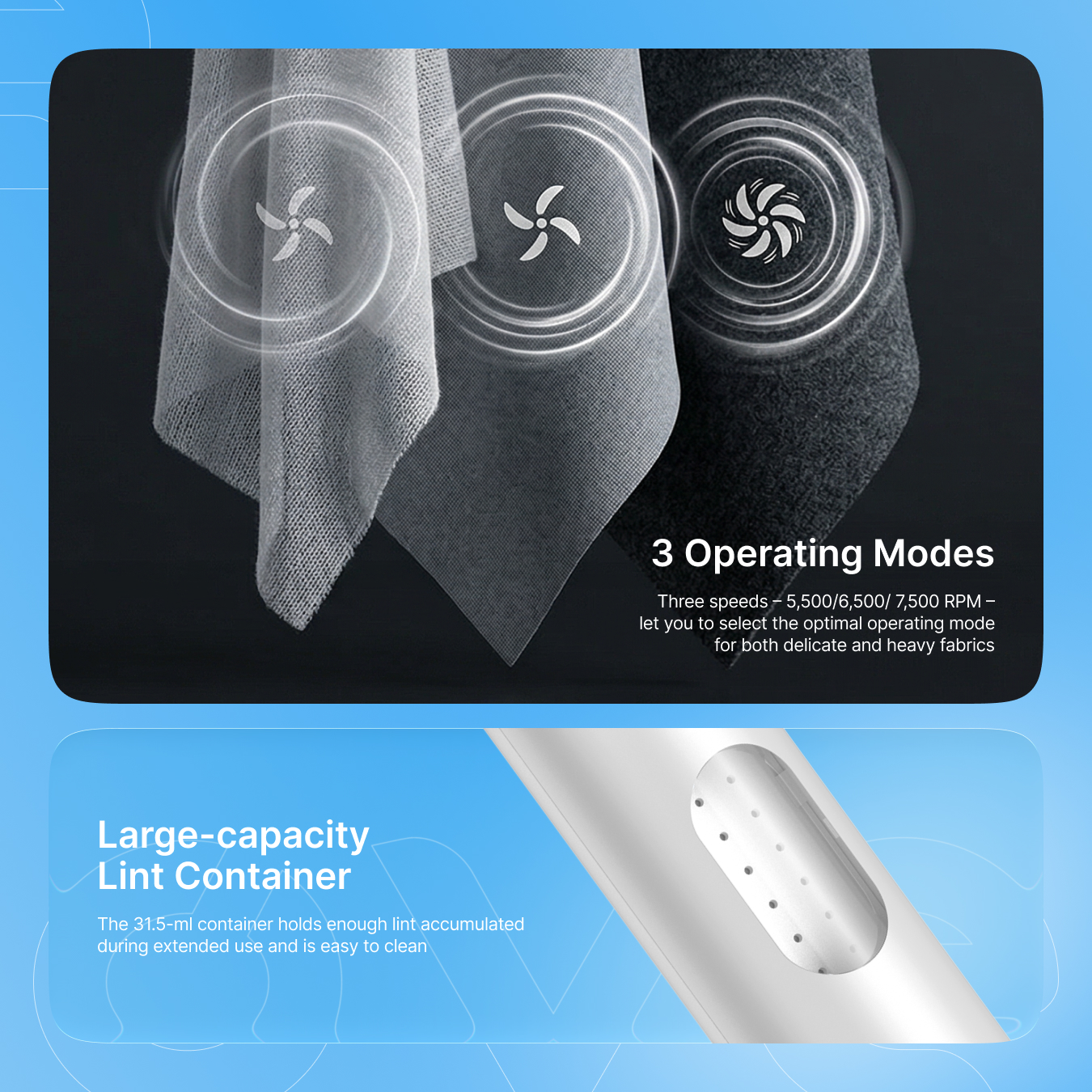 Three speed settings allow you to adjust the cleaning to suit delicate or coarse fabrics. Thanks to the powerful motor and wide working area, lint disappears quickly and the fabric remains undamaged. The device does not turn on without the cover, making it safe to use. Its compact size allows you to take it with you on trips or store it at home without taking up extra space.