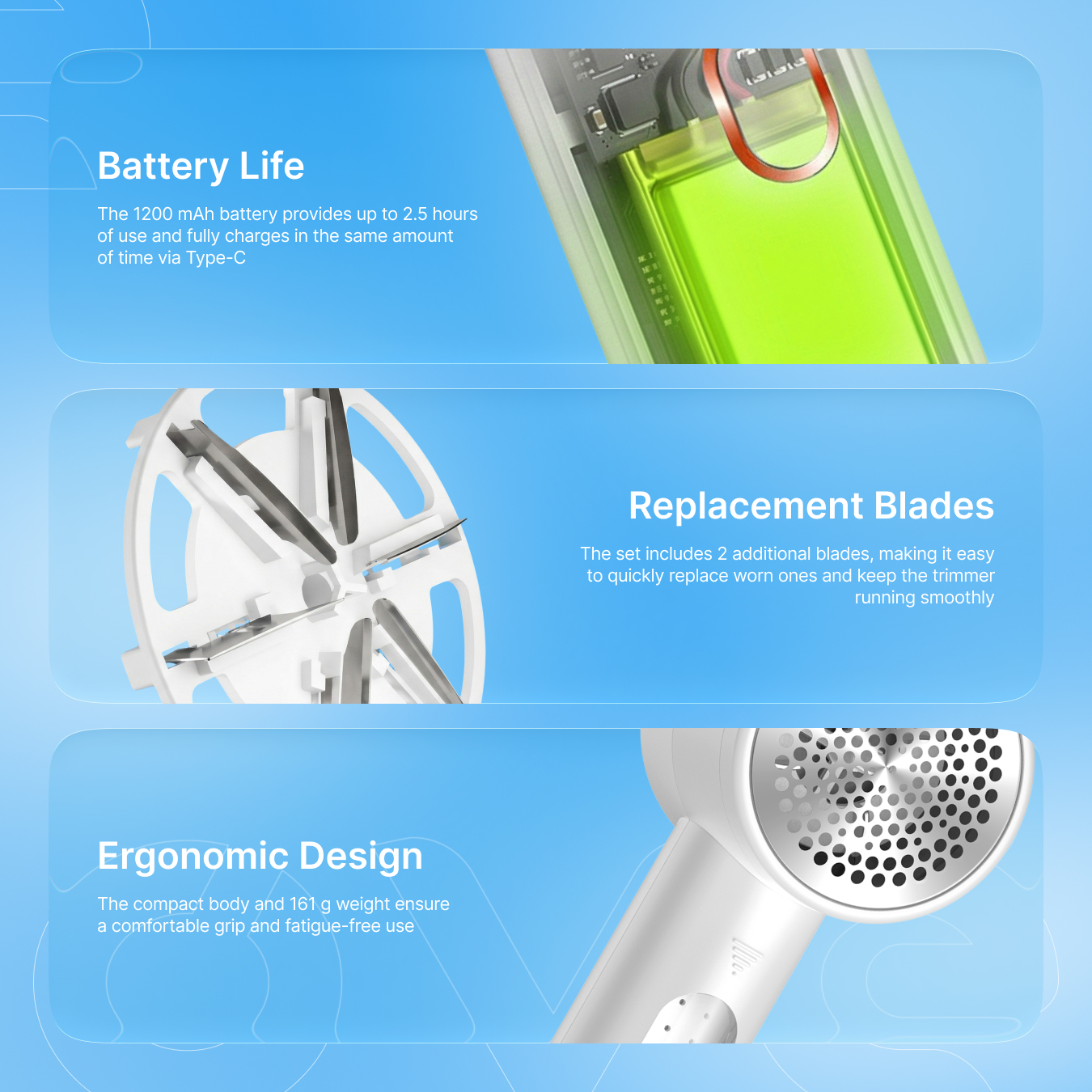Easy to use even with one hand, this compact device has a comfortable shape and a soft, non-slip coating. It is easy to hold even during prolonged use, and the lint container can be easily removed and cleaned in seconds. It charges via a convenient Type-C cable, just like a smartphone.