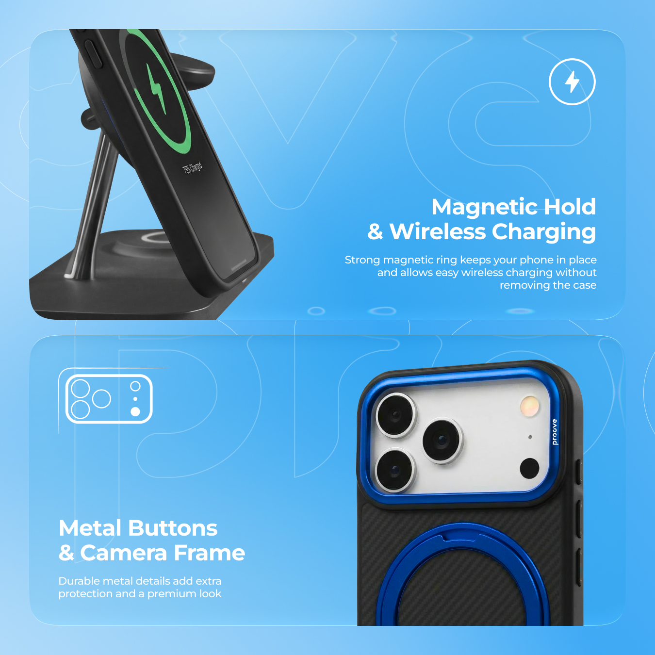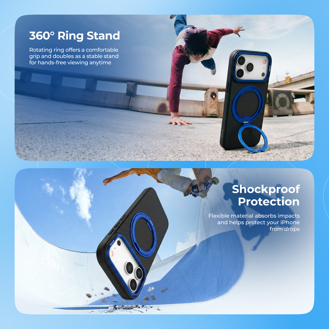 The ring on the back of the case serves two functions. It acts as the familiar Magnetic Ring that securely attaches your device to magnetic mounts and chargers. Additionally, when pulled towards you, it transforms into a convenient stand, allowing you to watch videos or work with your phone in hands-free mode.