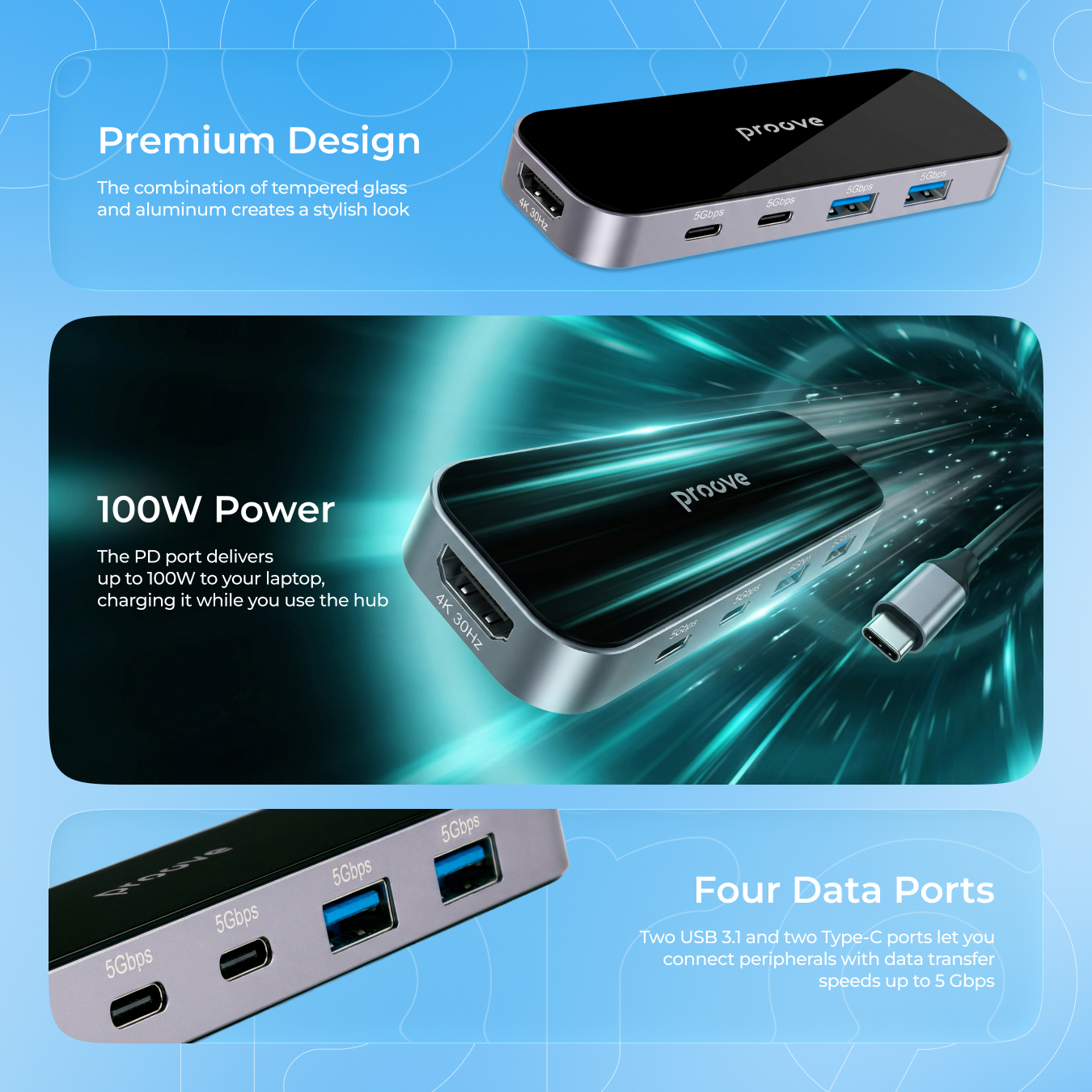 Proove Shadow is a multifunctional Type-C hub that allows connecting various devices via multiple ports. It is equipped with two USB 3.1 and two Type-C ports. Supporting HDMI, compatibility with Windows, MacOS, and Linux, this hub expands the capabilities of your devices.
