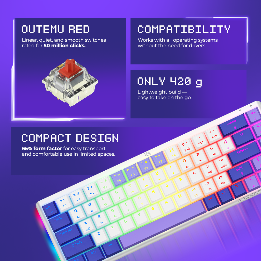Compact keyboard with bright RGB backlighting that adds style while you work or play. Thanks to Outemu Red mechanical switches, the keys provide smooth and quiet keystrokes — a great choice for both gamers and office work.