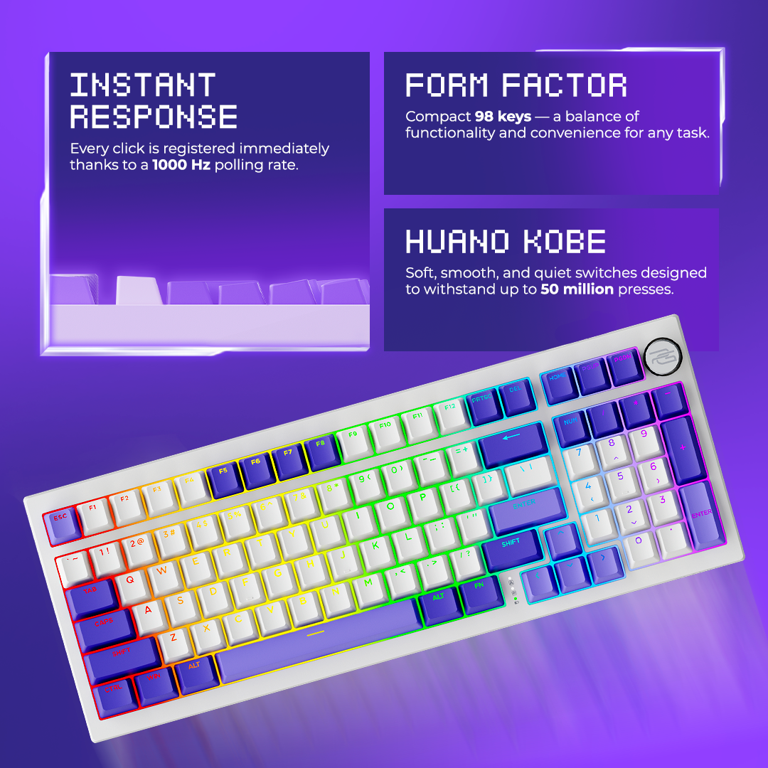 The full-size 98-key layout with multimedia and macro support ensures convenience and efficiency in any usage scenario. A 1000 Hz response time guarantees instant response to every keystroke. The keyboard is compatible with Windows, macOS, and Linux.