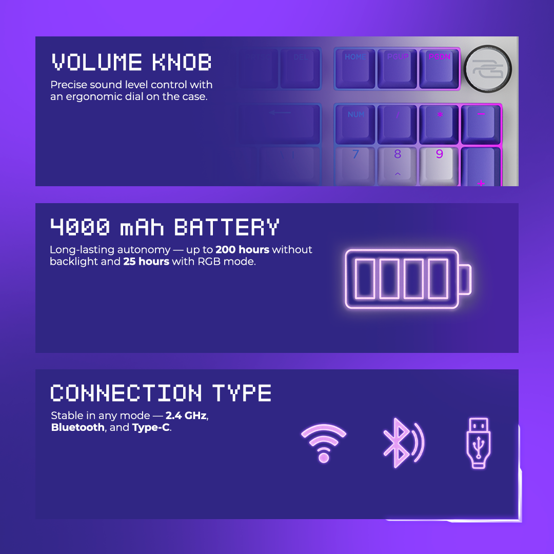 The keyboard supports three connection types — Bluetooth 5.3, 2.4 GHz, and USB — allowing you to flexibly change the operating mode. The 4000 mAh battery provides up to 200 hours of battery life without backlighting. Thanks to its durable ABS plastic body, the keyboard can withstand daily use.