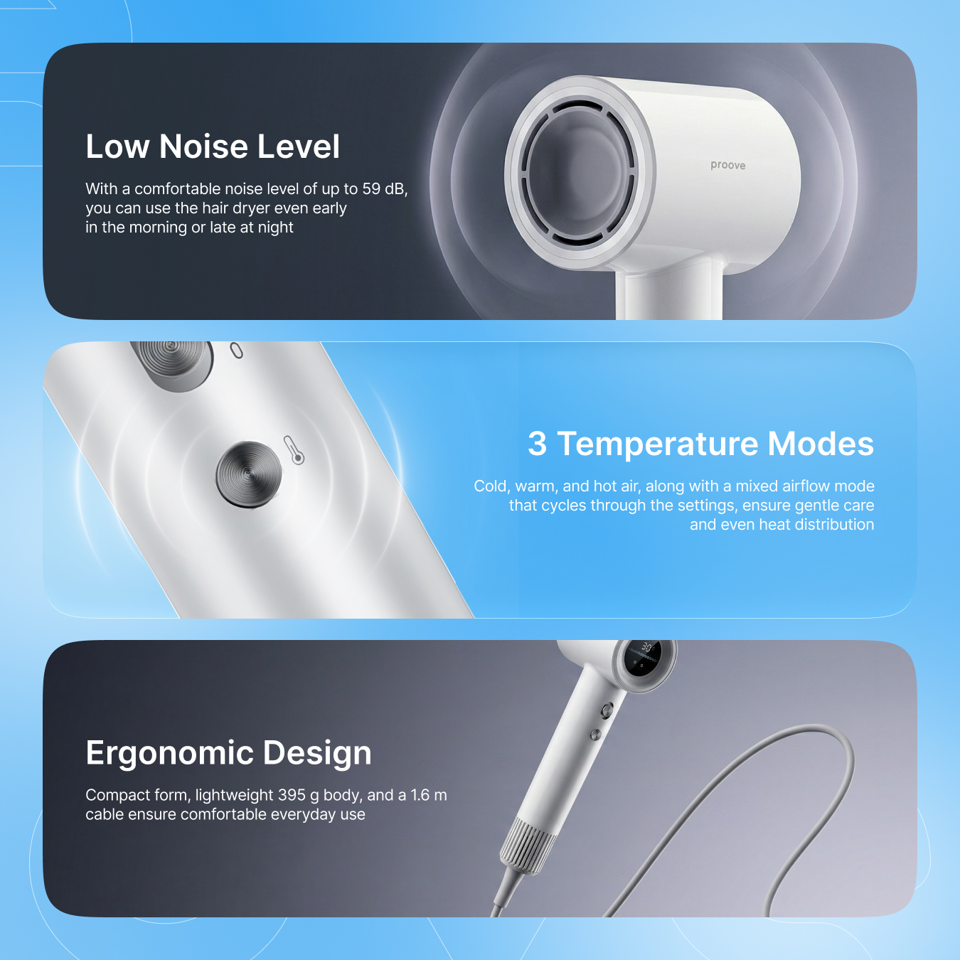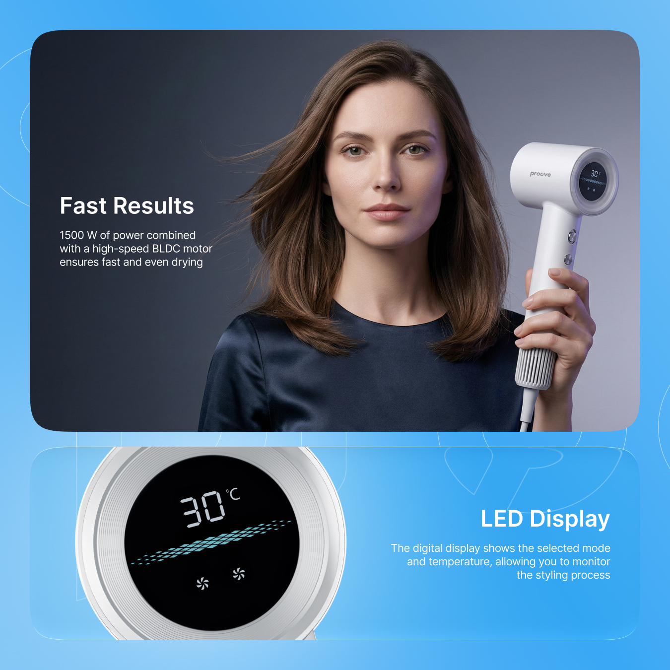 Power 1500W; airflow ionization; LED display; quiet operation; 3 operating modes; magnetic attachment; lightweight and compact body.