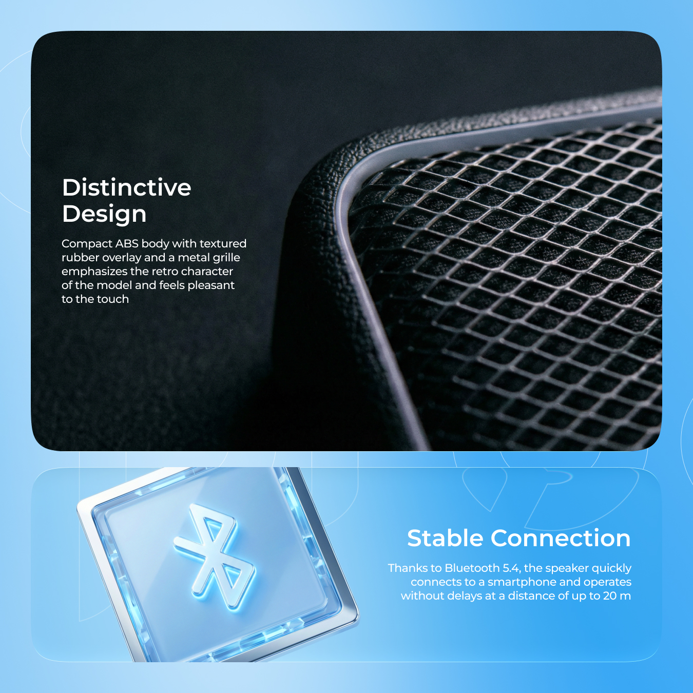 The model is equipped with a 15W speaker that delivers clear sound with pleasant bass and well-balanced frequencies. Mobile app support allows you to adjust the equalizer and control sound modes with a single touch from your smartphone. A stable wireless connection ensures comfortable, uninterrupted use.