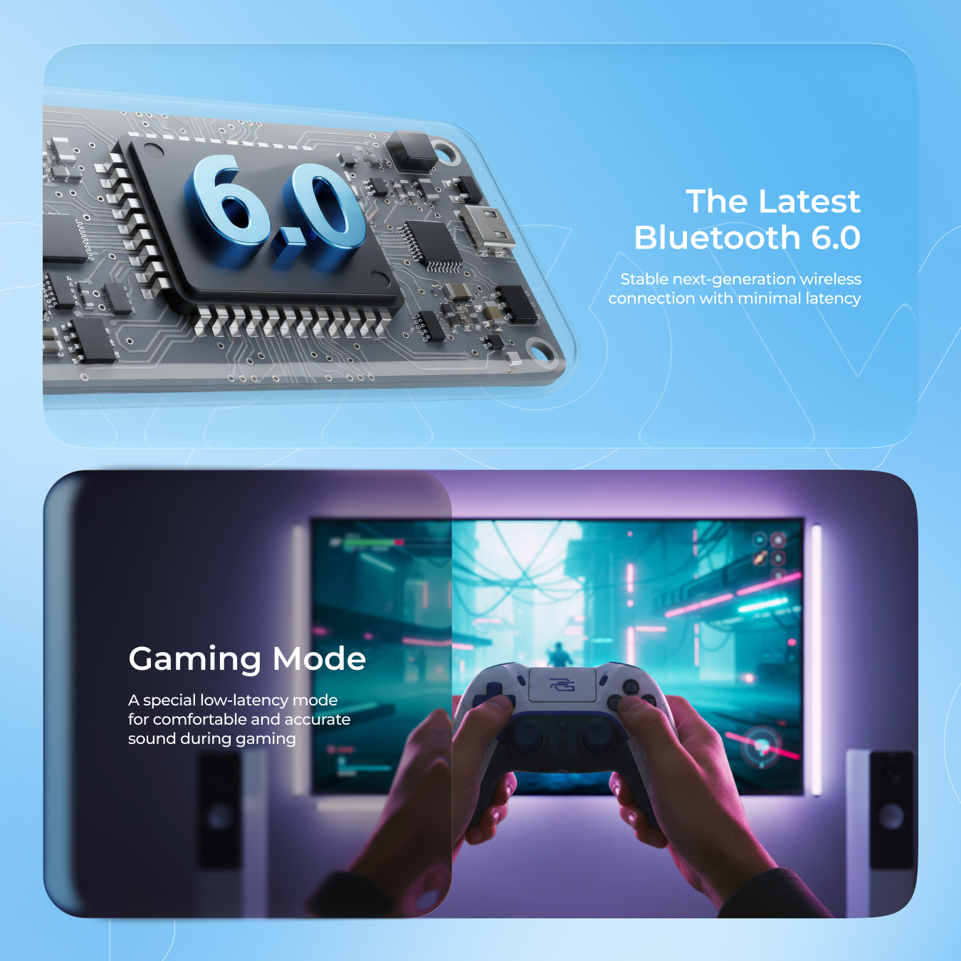 Bluetooth 6.0 technology provides a reliable wireless connection with low latency. Support for A2DP, AVRCP, and HFP profiles makes the model versatile for music, calls, and playback control. The combination of ABS, PU, and metal adds strength and comfort for long-term use.
