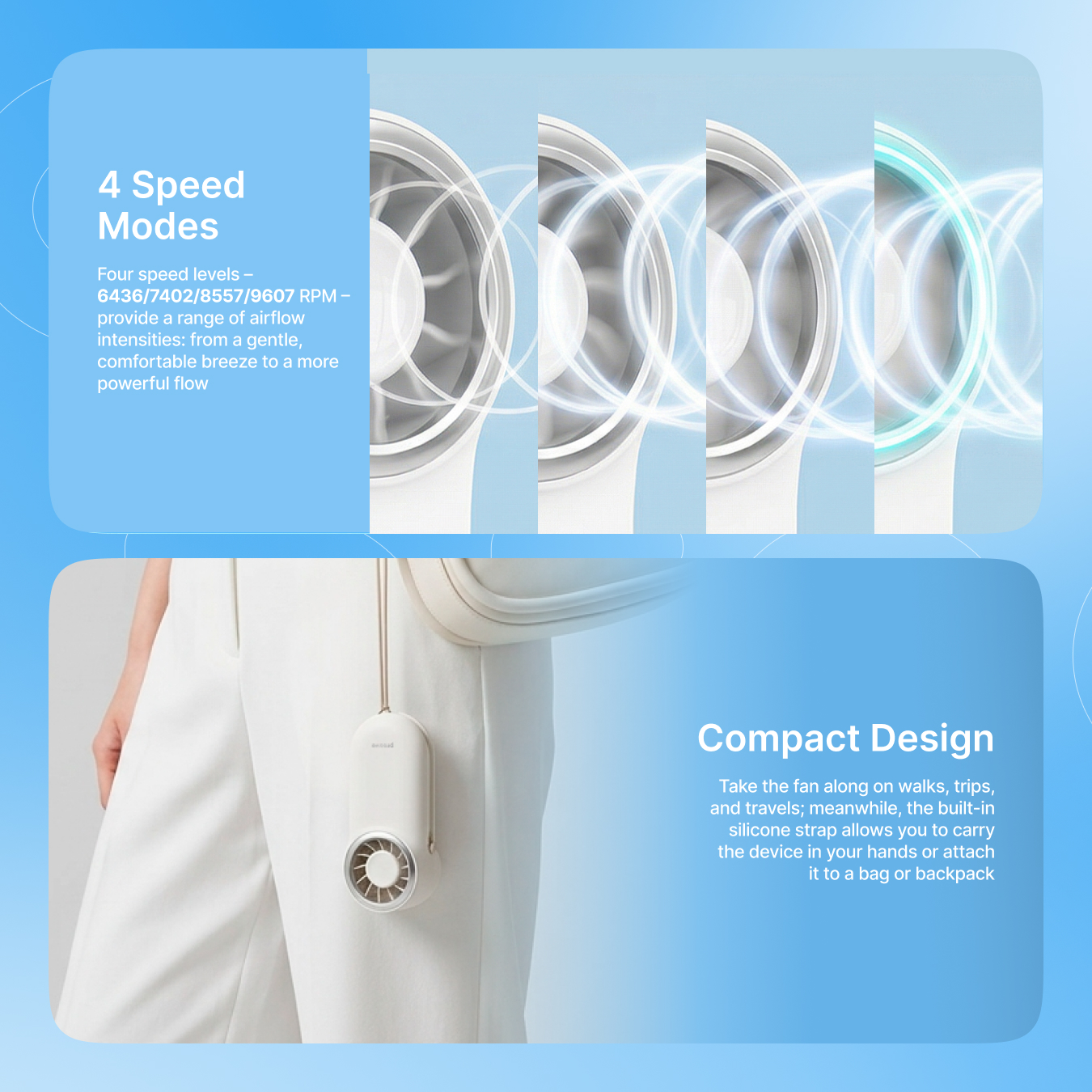 The fan weighs only 112 g and fits easily in a bag or backpack. The durable ABS plastic case can withstand daily adventures. And thanks to the built-in strap, the gadget is convenient to carry with you or attach to your bag.