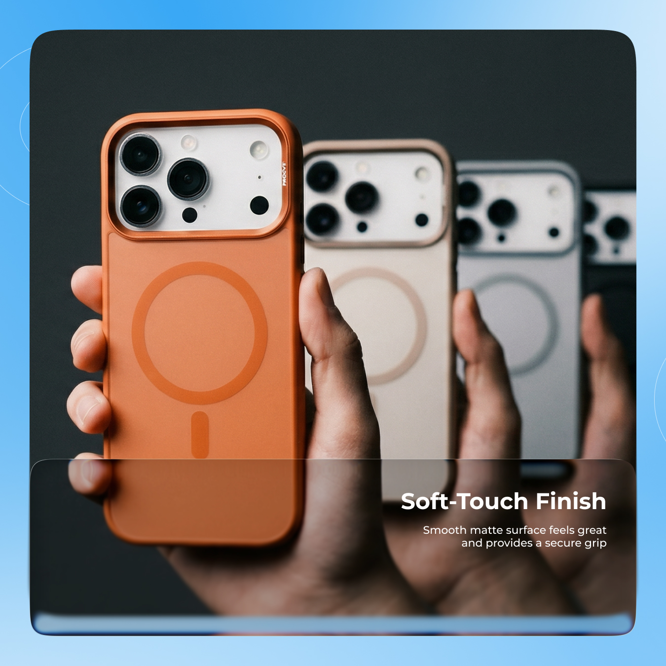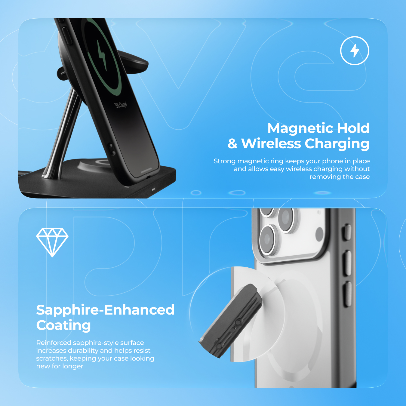 Magnetic ring; sapphire coating; scratch protection; shock resistance; metal buttons and camera frame; soft-touch cover.