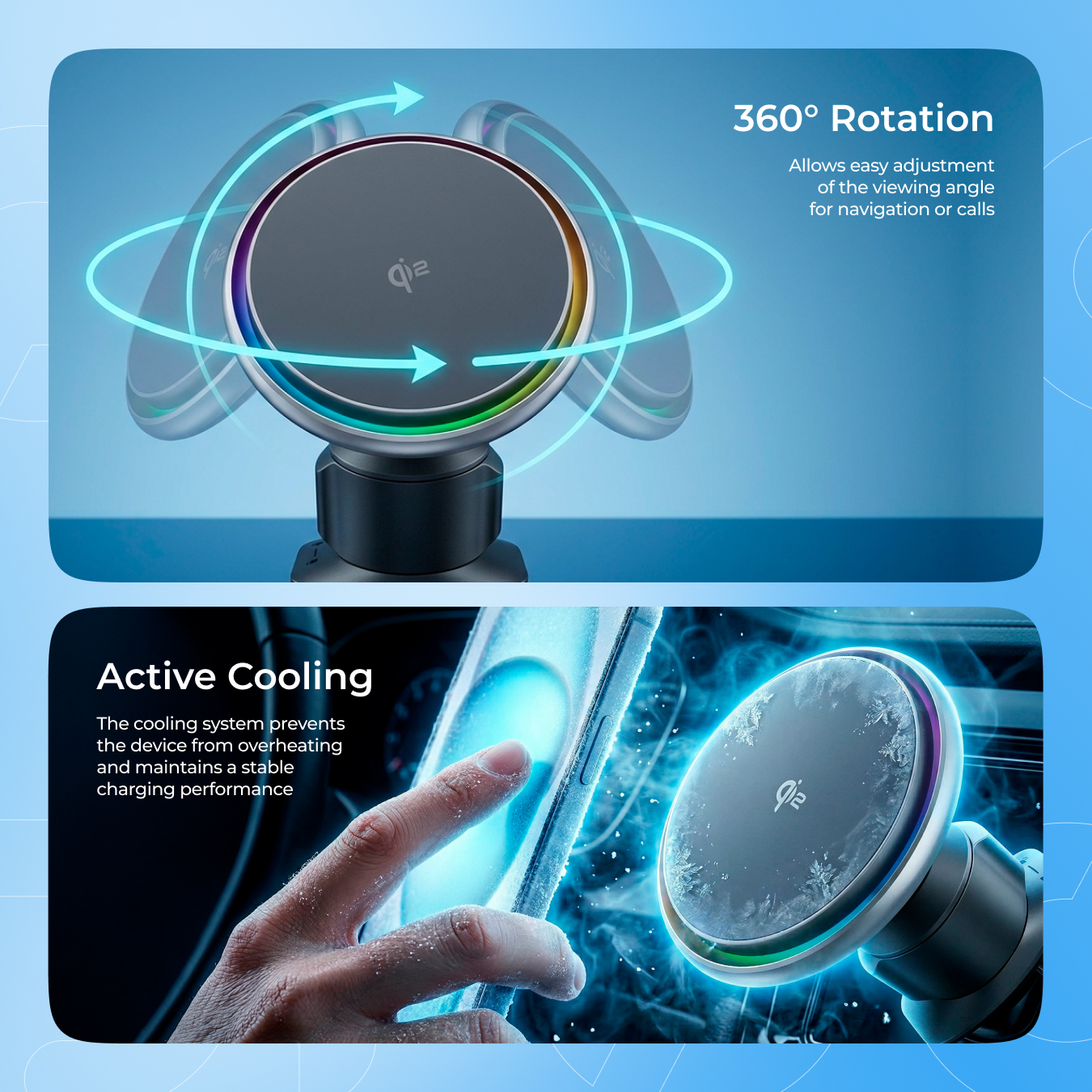 Supports Qi2 wireless charging with up to 15W of power, compatible with all Qi2-enabled devices, as well as iPhone 12+ and smartphones with a magnetic ring. Charging is possible at a distance of up to 6 mm, allowing the use of a case. Power is supplied via a Type-C connector. An integrated active cooling system prevents overheating during fast charging, ensuring stable operation and safety.