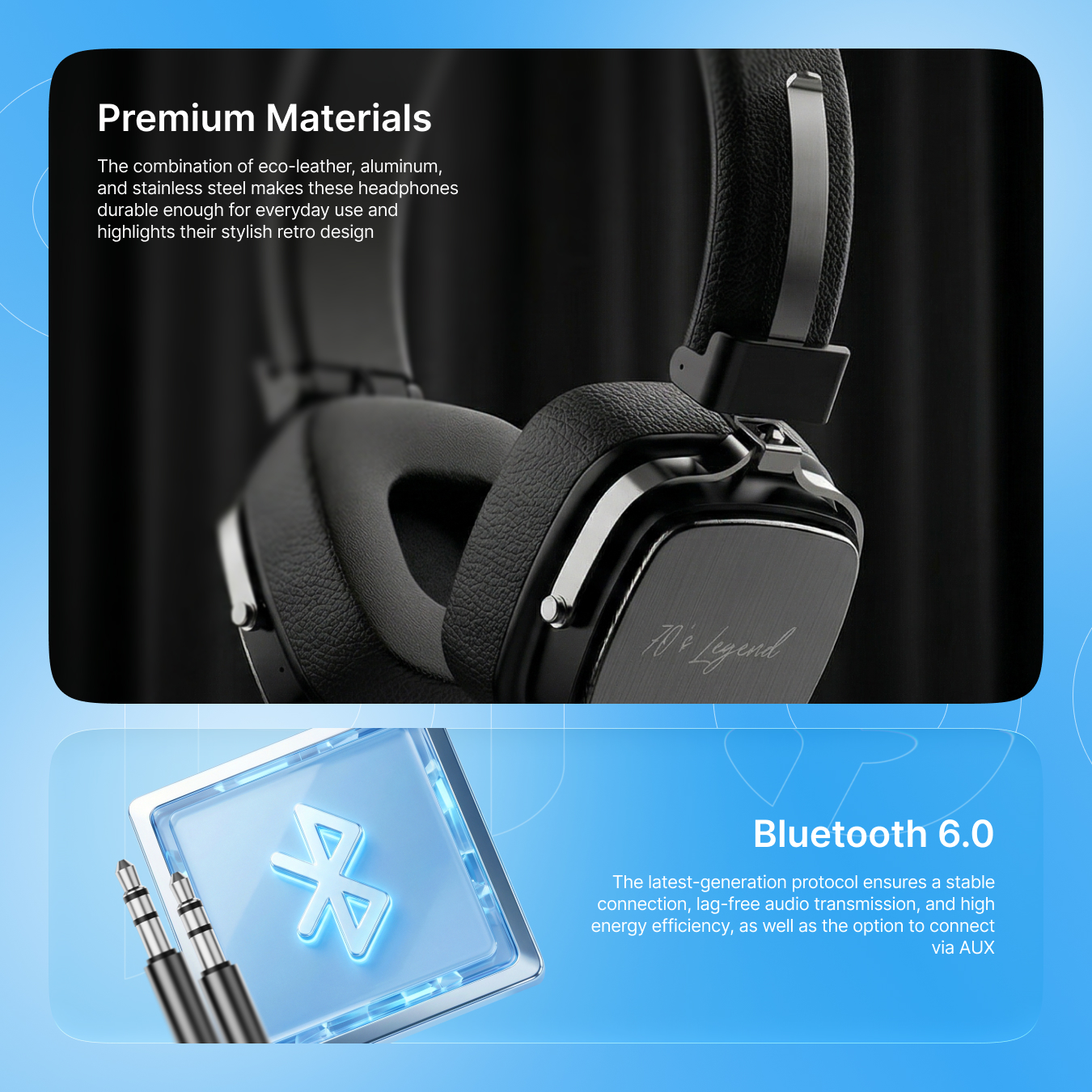 Proove 70’s Legend headphones are designed for clear, rich sound without overpowering bass or treble. Large 40 mm drivers deliver tight low frequencies, clear vocals, and well-defined details even at medium volume. The 20–20,000 Hz frequency range preserves the character of each track, regardless of genre.