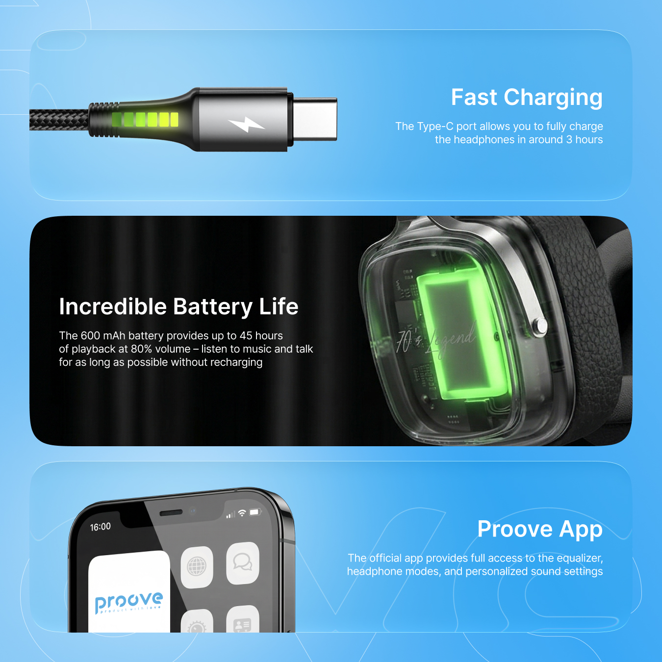 The headphones run on Bluetooth 6.0, ensuring fast pairing, a stable signal, and low latency. Game Mode reduces audio delay during gaming and video viewing. Control via the Proove mobile app allows you to adjust the equalizer and sound modes.