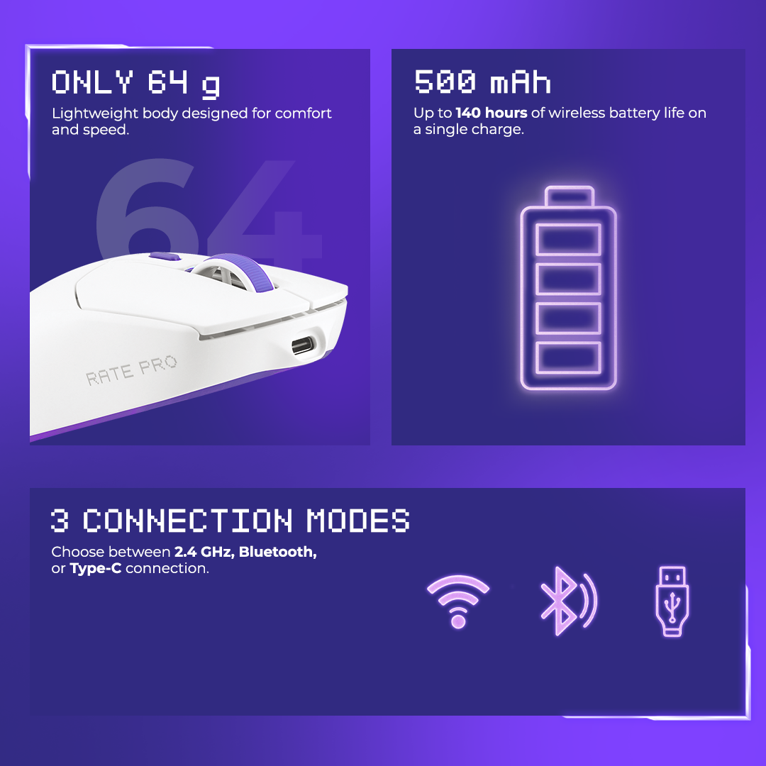 Thanks to optimized power efficiency, a new sensor, and a larger capacity battery, the Proove Gaming Rate Pro sets new standards for gaming endurance. With up to 140 hours of playtime in wireless mode and just 2 hours to fully charge, it keeps you in action longer. Simply connect the included Type-C cable, switch to wired mode, and keep gaming without interruption.