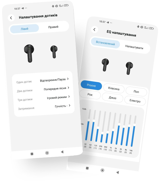 Налаштовуйте елементи керування, режими шумозаглушення та еквалайзер. Контролюйте заряд кожного навушника та кейса.
