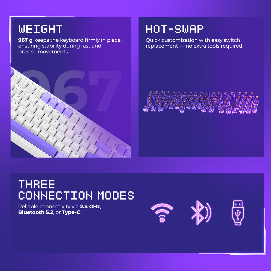 Клавіатура оснащена перемикачем, який здатен контролювати гучність звуку. На клавіатурі можна змінювати світчі, що забезпечить різний ігровий досвід. Регульована RGB-підсвітка має різні режими, забарвлення тощо, тому не стримуйте свою фантазію та кастомізуйте аксесуар так, як забажається.