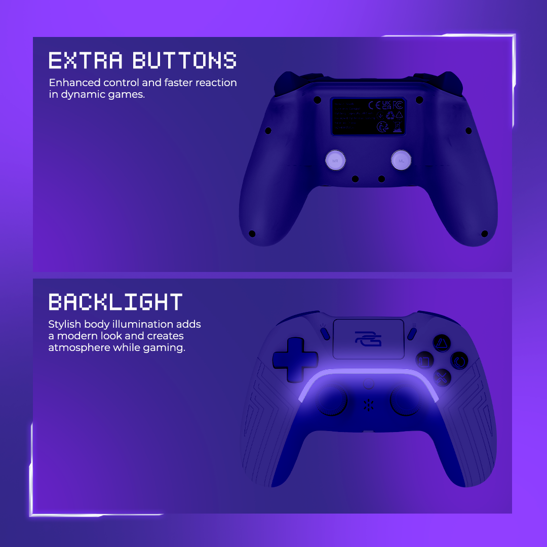 The gaming gamepad has an ergonomic shape that provides comfort during long gaming sessions. The buttons are well placed and the joysticks have a textured surface for precise control. The design combines a stylish look with modern lighting elements.