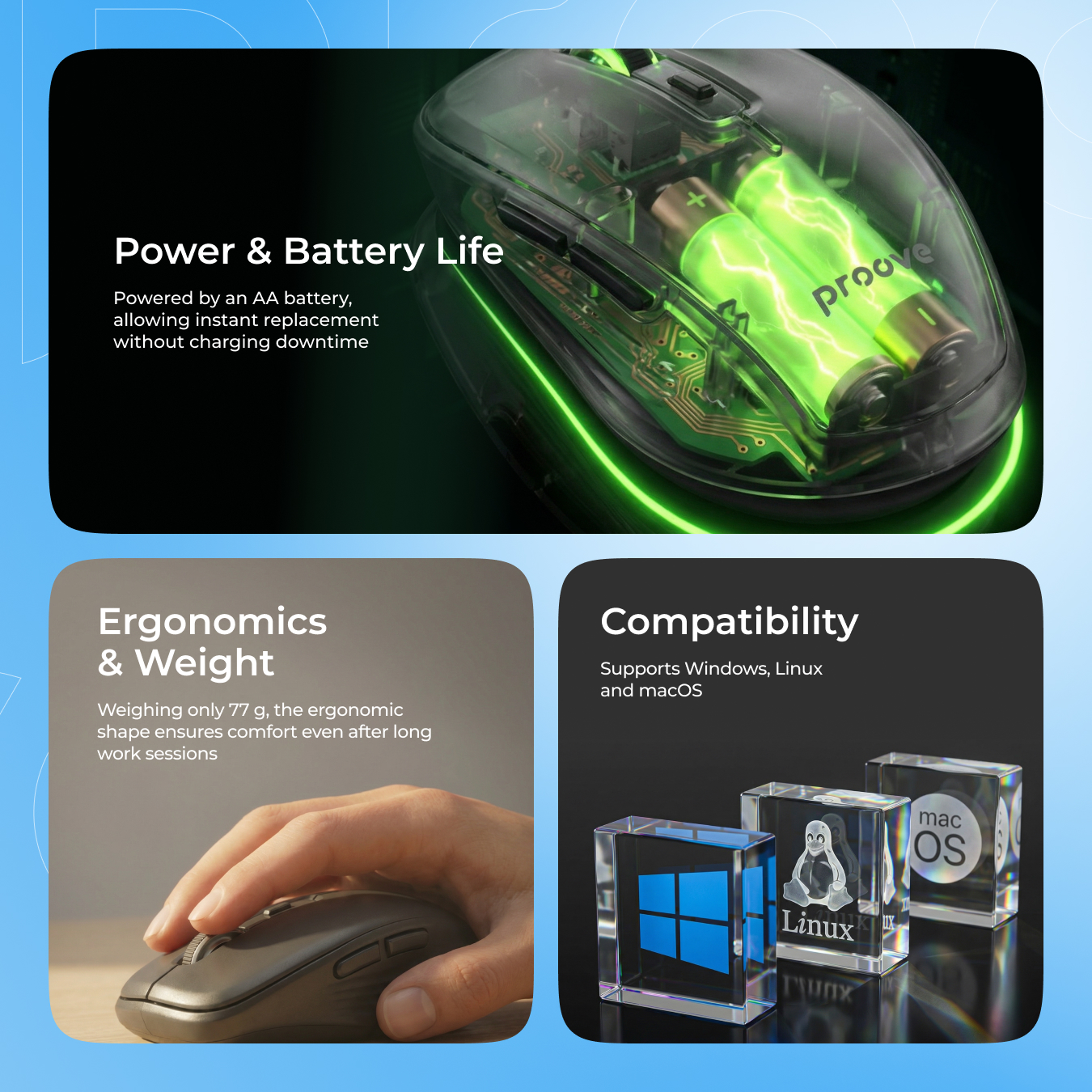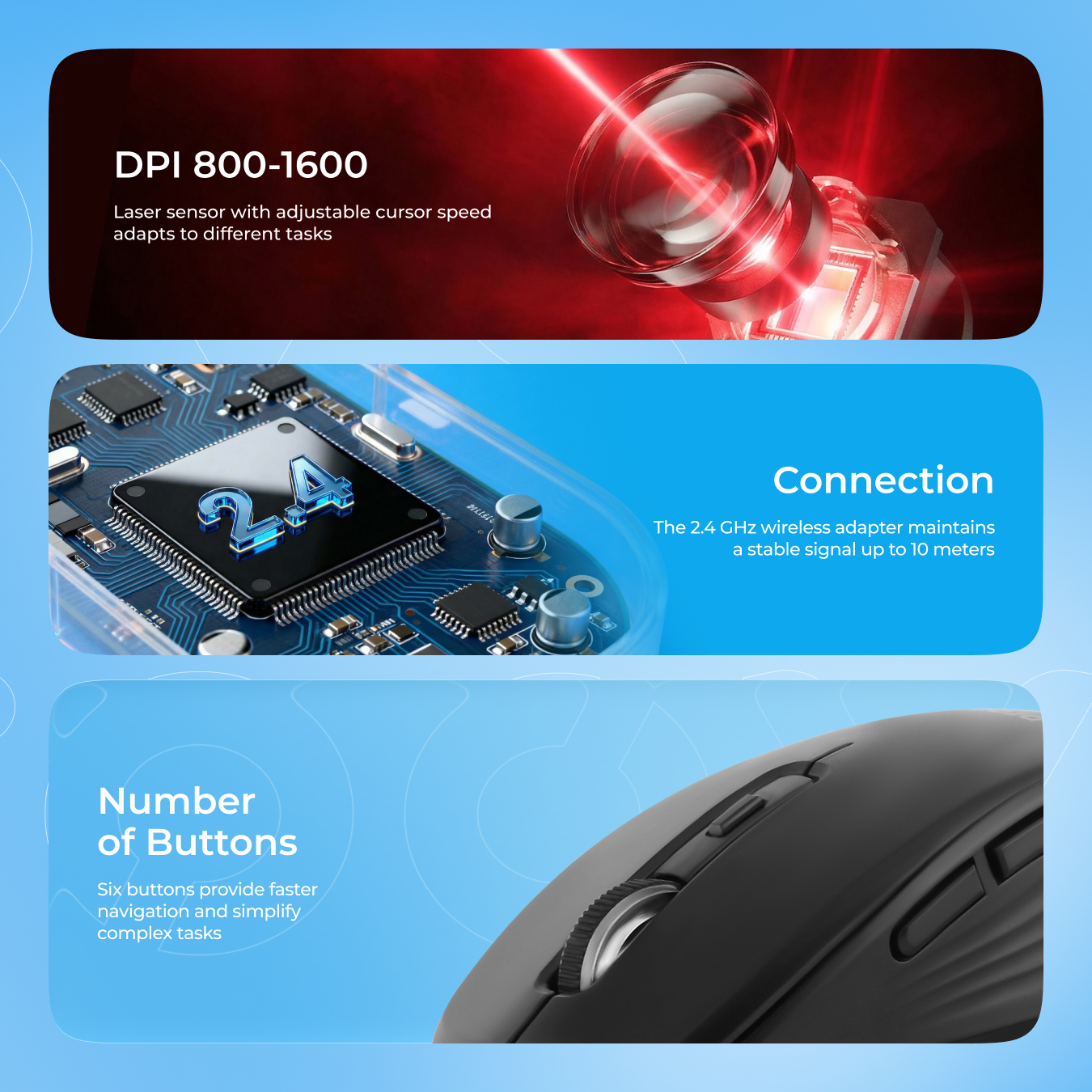 This wireless mouse delivers reliable connectivity with 2.4 GHz technology and a working distance of up to 10 metres, allowing you to move freely without wires. It has three DPI levels that can be easily switched to adapt the mouse sensitivity to different tasks.